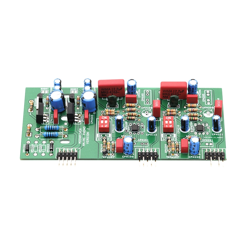 Filtre assemblé à la main sans circuit imprimé, les composants sont orientés et soudés avec une soudure à l’argent directement les uns aux autres afin d’éviter toute perte d’insertion. Ils sont collés sur une plaque en matériau antivibratoire, et sont disposés le plus loin possible de toute perturbation électromagnétique.