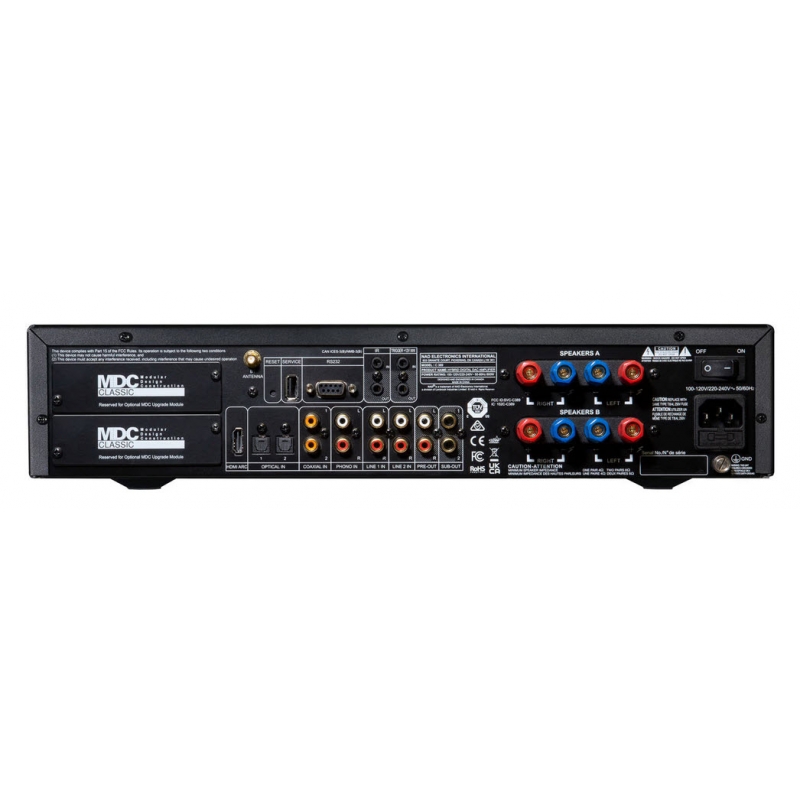 Au menu, de nouveaux modules d'amplification UcD HybridDigital, un dac ESS Sabre 9028 32 bits/384 kHz identique à celui qui équipe le M33, une entrée HDMI-eARC et il est maintenant compatible avec le module MDC2 BluOS-D qui intègre une licence Dirac pour la correction de pièce. Par ailleurs, son entrée phono (MM) a été optimisée et son entrée Bluetooth devient aptX HD. En revanche, il ne propose plus que 2 x 130 W au-lieu de 2 x 150 W mais sa puissance - et son amplification en classe D - lui permettront d'alimenter quasiment n'importe quelles enceintes.
